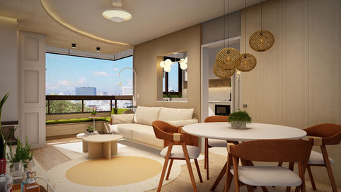 Apartamento com projeto de interiores que valoriza a fluidez dos acessos e circulações, com elementos arredondados, curvos e orgânicos. Trazendo a leveza das formas e cores da natureza, com tons de azul e verde, texturas amadeiradas e o toque especial do efeito velvet no forro da sala e na suíte.