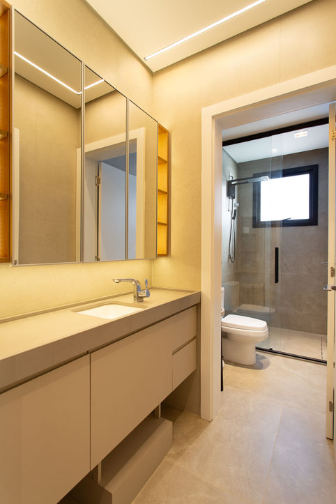 A sala de jantar como centro do espaço social integrado. A cozinha como península com cooktop de indução permite a interação entre quem cozinha e o restante do espaço social, enquanto a bancada da pia, com janela de rodabanca, conecta o ambiente ao espaço gourmet e ao pátio externo. Soluções inteligentes para um dia a dia mais prático e acolhedor.