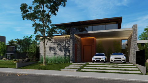 Em nossos projetos, sempre presamos pela linguagem única da casa, onde a fachada frontal é continuidade das laterais e fundos e vice versa, tudo é uma coisa única que se complementa, inclusive com os espaços interiores! Nessa casa utilizamos a continuidade de materiais, trazendo os elementos que traduzem a casa, para todas as faces! Essa casa é localizada em um lote em condomínio fechado, com 14 metros de testada por 25 metros de profundidade, foi planejada para atender uma família que ama viajar e trouxe referências arquitetônicas de vários cantos do mundo. Nossa metodologia nesse projeto, foi um tanto diferente, pois primeiro definimos a funcionalidade e a forma volumétrica primeiro, depois definimos os materiais, que unem vários ícones de estilos de arquitetura diferentes, como a pedra miracema bruta nas paredes, a parede em concreto de ripas largas, a madeira e o item que faz a maior diferença na composição, a marquise metálica com forro em madeira!